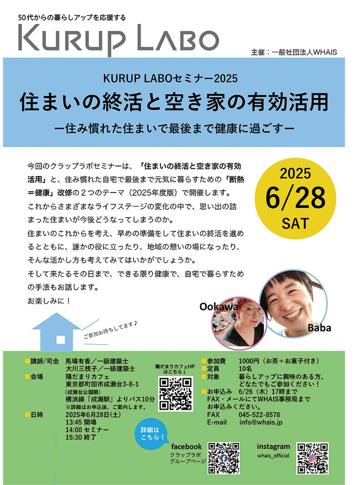 一般社団法人WHAIS(北新横浜・岡野美紀子代表理事)は6月28日(土)、陽だまりカフェ(東京都町田市成瀬台3の8の1)で「KURUP LABOセミナー2025 住まいの終活と空き家の有効活用」を開催する。午後2時開始(15分前開場)。定員10人。要予約。参加費1000円(茶菓子付)。