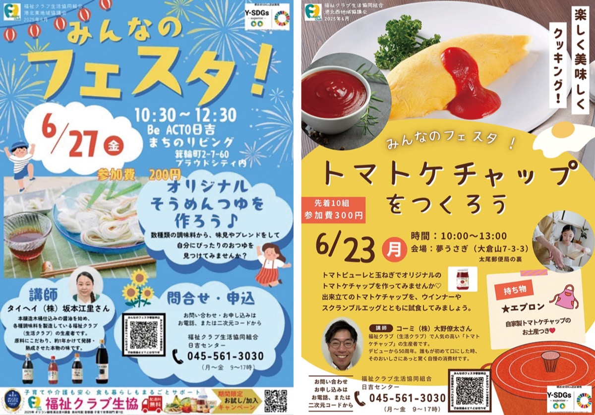 6月27日(金)は、「オリジナルそうめんつゆを作ろう♪」=画像左(チラシ)。会場はプラウドシティ日吉内の共用部「Be ACTO日吉まちのリビング」(箕輪町2の7の60)で、午前10時30分から午後0時30分まで。生産者のタイヘイ(株)・坂本江里さんを講師に迎え、数種類の調味料からブレンドして自分にピッタリのつゆを作る。参加費200円。
