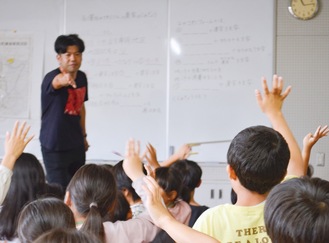 新羽小学校(佐藤恵子校長)で6月12日、3年生75人を対象にした授業「長澤さんの農家の仕事」が行われた。新羽町で農家を営む”ながさわファーム”の長澤佑典さんを講師に招くかたちで、2020年から毎年実施されている。同校3年生の社会科や理科の授業内容と絡めながら、横浜市内の農家の仕事・地産地消についてクイズ形式で進行され、児童らは長澤さんの話に耳を傾け、熱心にメモをとる様子もみられた。