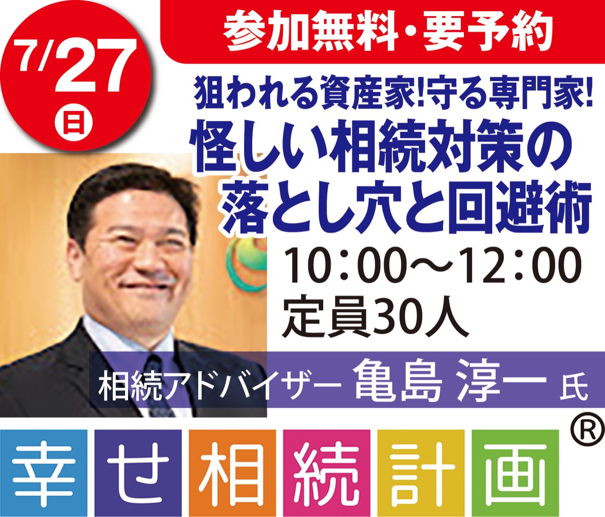 当日は、相続アドバイザーの亀島淳一氏=(一社)全国幸せ相続計画ネットワーク代表理事=が講師を務め、「相続で家族をもめさせない」「相続で優良財産を減らさない」「子や孫を将来お金で困らせない」がモットーの「幸せ相続計画」を基に、相続トラブルの主な原因となる不動産の生前対策などをわかりやすく解説する。