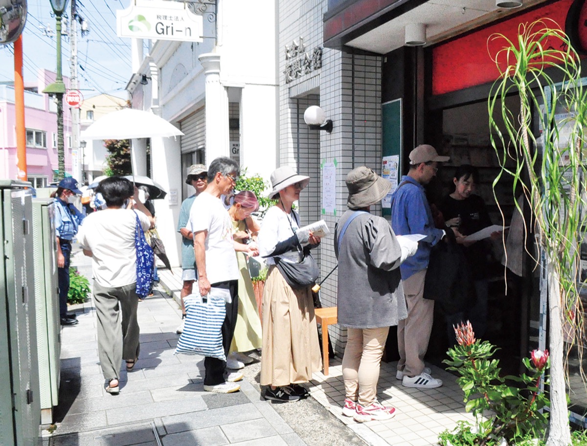 先頭に並び、一番で商品券を購入したのは大倉山在住の親子。父親は毎年、パン店やコーヒー店などで利用すると話し、小学3年生の娘は「かき氷を食べに連れて行ってもらう」と笑顔で話した。また、毎年購入するという大倉山在住の女性(85)は「マルシェの野菜など、日常使いができるのがとても助かる」と喜んでいた。