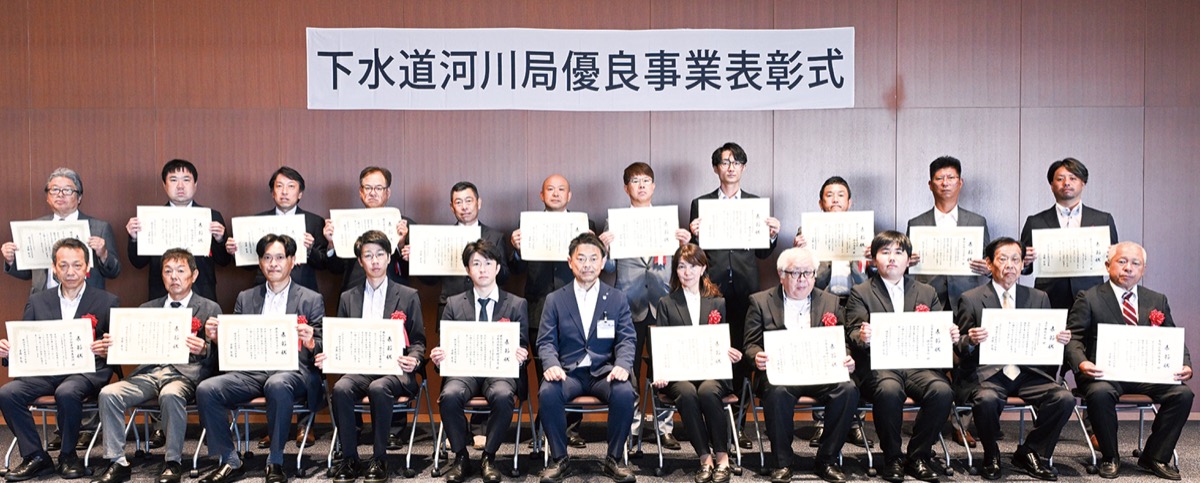 表彰は、下水道や河川の工事及び委託業務の中で、優れた提案や成果などをもって業務を完了させた事業者などが対象。技術及び意欲の向上を図り、今後の更なる適正な施工や業務遂行につなげることが目的だ。今年度は、工事で13社、委託業務で8社が選ばれた。