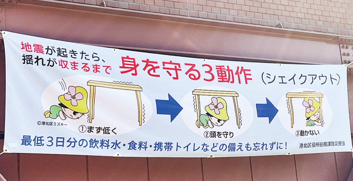 港北区では、いつ起きてもおかしくない大地震に備え、地震発生時の安全確保行動を身に着ける「シェイクアウト訓練」を、9月1日から30日の間、各家庭や職場、自治会・町内会館などで実施するよう、呼び掛けている。