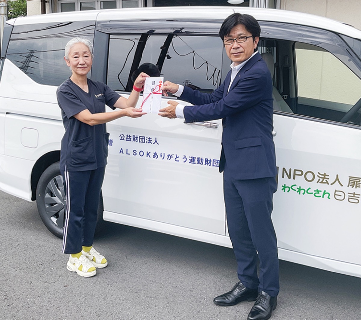 綜合警備保障ALSOKの社会貢献活動として、福祉団体などを支援する公益財団法人ALSOKありがとう運動財団(東京都港区)が8月22日、日吉にある重症心身障がい児デイサービスわくわくさん日吉の扉(NPO法人扉)に福祉車両1台を贈った。利用者の移動に欠かせない車いす対応の福祉車両に、同法人では、「大変ありがたい寄付」と喜んでいる。