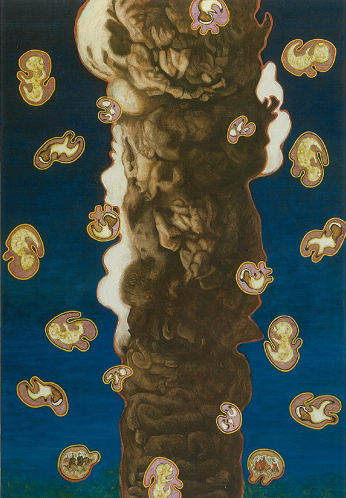 「バイキン」のある作品の一つに、長崎での記憶を描いたものがある。2015年に制作した油絵作品「夏・3.5Kmの記憶II(長崎市)」だ。100号(162.1cm×112.1cm)のキャンバスには、1945年8月9日、15歳の時に爆心地から3.5Km離れた場所から見た、B29から投下された原子爆弾が爆発した瞬間が表現されている。