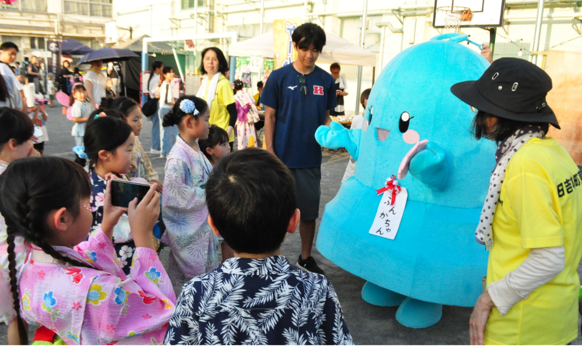 やぐらには昨年同様、日吉商店街などの提灯が張り巡らされ、きらびやかなやぐらの周りで、参加者らは輪になり踊った。地元商店や町会団体による夜店に行列ができる中、同小学校150周年を記念して誕生したマスコットのぶんかちゃんも登場。子どもたちは代わるがわる撮影をするなどして、楽しんでいた。