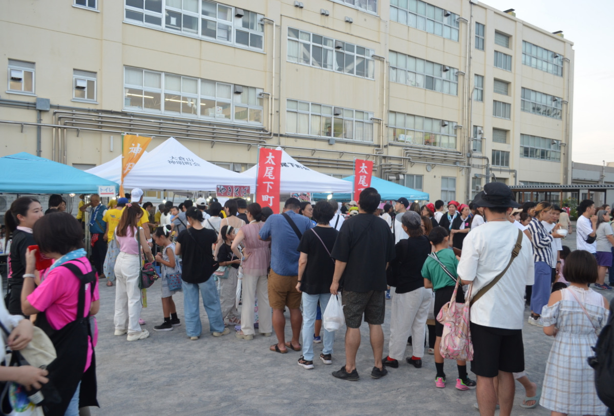 太尾小学校校庭・校舎で8月23日、ふるさとまつり実行委員会(竹崎理浩実行委員長)主催の「太尾小学校ふるさとまつり」が開催された。毎年同小夏休み最後の土曜日に実施されるイベントで、今年で15回目を迎えた。各町内会や近隣高校・大学・企業、そして同小の5・6年生が飲食物やミニゲームなどの露店を20以上出店。同小校庭と校舎は地域住民や卒業生、在校生家族など多くの人が賑わっていた。各ブースでの売り上げは全て学校経営を支えるための基金に充てられる。