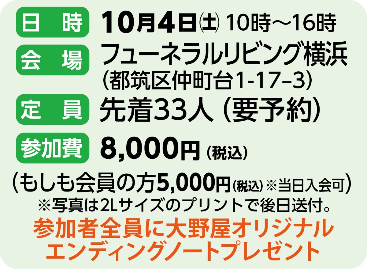 参加費は8千円(「もしも会員」は5千円、当日入会可)。この機会に納得の1枚を選んでみては。参加者全員に終活に役立つオリジナルエンディングノートを進呈。