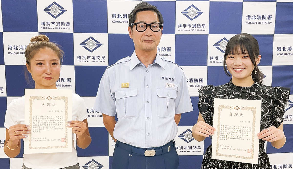 新横浜の居酒屋で倒れ、心肺停止状態になった男性を、連携し、迅速な救命処置で助けたとして、港北消防署(長谷部宏光署長)は9月8日、区内在住の友井川依里香さん(26)と、友人の小林萌さん(21)に感謝状を贈呈した。