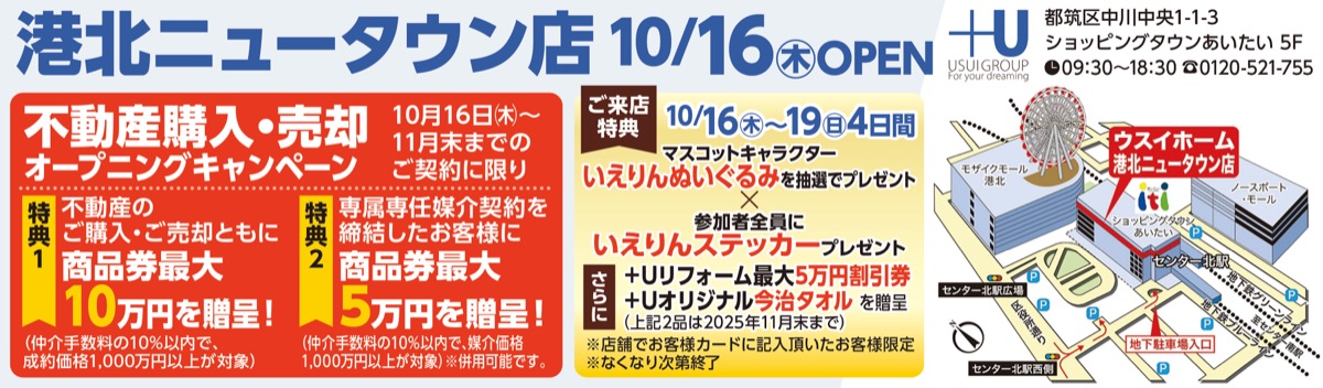県内に40拠点を置く不動産事業者・ウスイホームは10月16日、センター北駅すぐに「港北ニュータウン店」をオープンする。これにより、新横浜店と合わせ、横浜北部エリアで2店舗体制に。地域に根差した不動産相談窓口として、情報網をさらに強化していく。