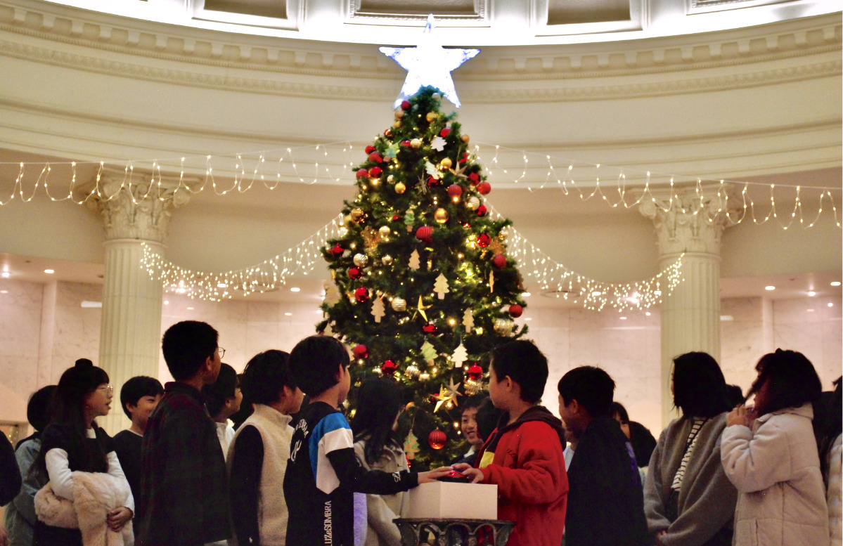 ツリーには、同校の4年2組36人の児童が製作した「ツリーオーナメント」が装飾され、12月25日(木)まで装飾を楽しめる。