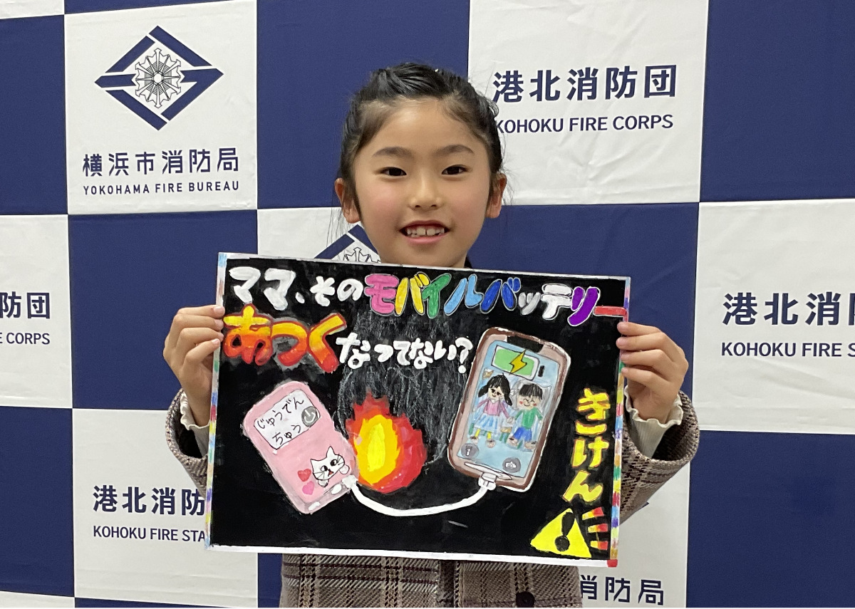 港北火災予防協会長賞を受賞した山崎楓奈さん(綱島東小1年)は、モバイルバッテリーが原因の火災を呼び掛けるポスターを作成。「テレビのニュースでよく見ていて、怖いと思ったから。ママも持っているので、危ないと思って描いた」と話す。受賞作は1週間ほどかけて作成したそうで「背景を黒く塗るのが大変だった」と語り、力作を掲げ微笑んだ。