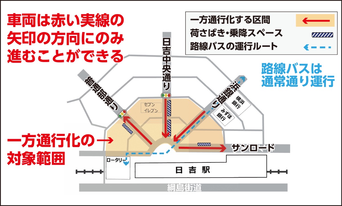 各通りは日別で工事が行われ、12月17日から19日の間(予定)に「普通部通り」「サンロード」「日吉中央通り」「浜銀通り」の順で交通規制が「車両一方通行」に変更となる。ただ、浜銀通りの路線バスに関しては従来通り相互通行、普通部通りの平日午前7時から9時までの車両通行止めは、引き続き行われる。