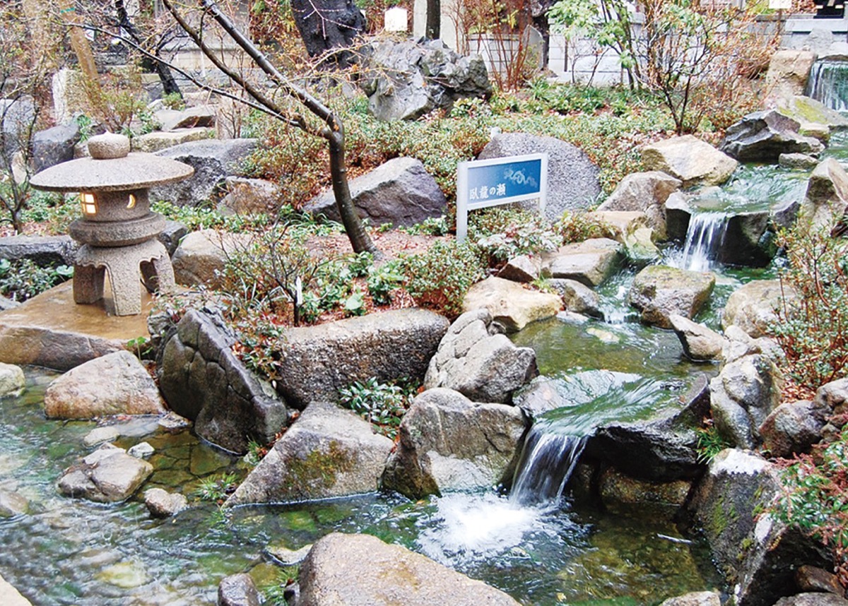本殿裏手にある庭園「令和神苑」に流れる地下水のオーバーフロー水や境内に降る雨水などを、導水管を通じて池に送る仕組み。工事では、既設の雨水桝に取水口を設置。境内から池までの間の坂道に沿って配管され、公道の地下を横断して池まで通じる約90mの導水管が布施された。