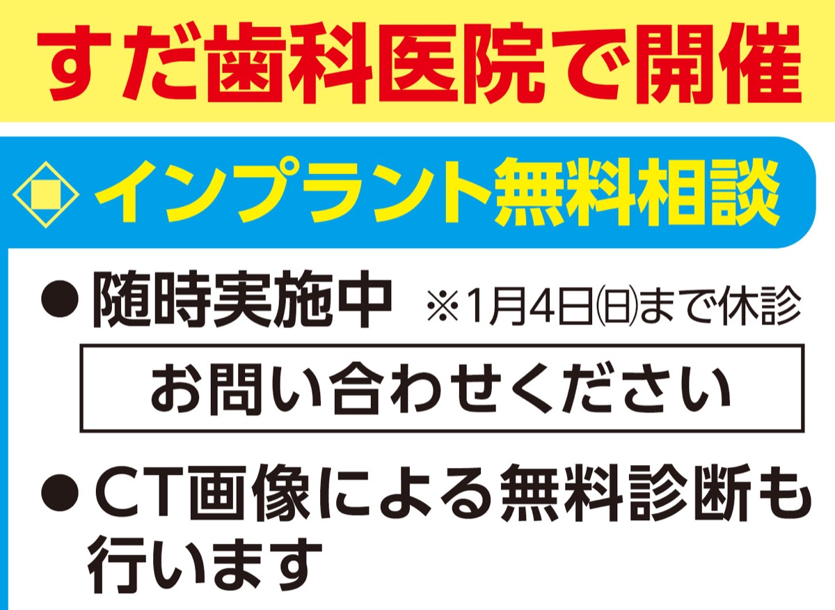 「すだ歯科医院(綱島西)」(ほか青葉区に1院)を運営する医療法人社団翔栄会(須田孝則理事長)では、今年もインプラントに関する無料相談を受け付ける。