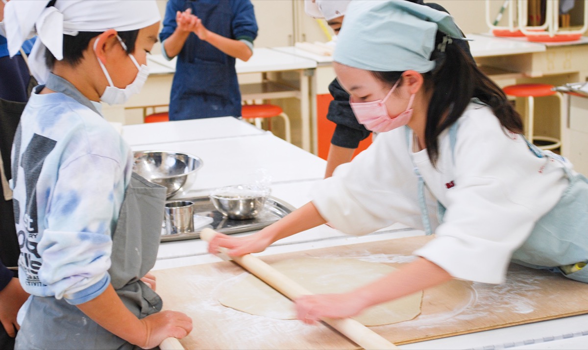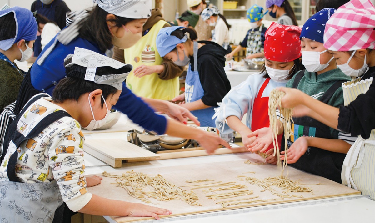 実は3回目となる同学習。前回は近所に店を構える大村庵の店主が参加し、児童にそば打ちを伝授した。教わったことの中でも、児童が大切にしていたのが「水分量」だ。その日の気温や湿度によって、そば生地に含ませる水分量を調節しなければならず、苦戦する児童がちらほら。それでも「打ち粉だ」「打ち粉はどこ」と、緩かった生地に打ち粉を施し、適度な硬さに仕上げ、しっかりとしたそば生地を完成させた。児童自ら答えを導き出す姿に、手伝いに駆けつけた保護者から「前回からの成長が見える」と感嘆の声が上がっていた。