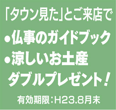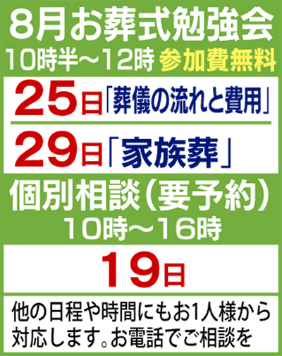 また、同社では毎月「お葬式勉強会」を開催。お葬式のいろはから、家族葬の長所・短所まで学べると評判となっている。もちろん、その中で花祭壇についても詳しく聞くこともできる。ちなみに8月は、暑さのピーク時間を避けようと10時半から12時の時間で開催し、”涼しいお土産”もご用意。一度足を運んでみては。