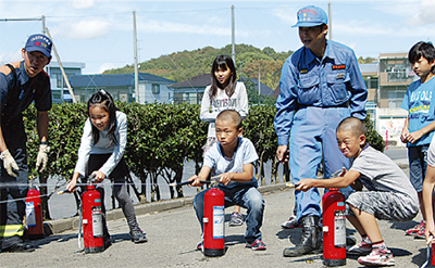 当日は、いざ火が出てしまった時の対応を寸劇で紹介。落ち着いて119番する大切さを伝えた。寸劇の後は、消火器と放水の体験も。消火器体験は、仮の的を用意し、「火の先ではなくて元の方をしっかり狙うこと」など、消火のコツを学んでいた。