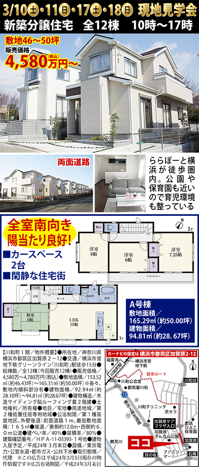 12棟は敷地46〜50坪4580万円〜、4LDKで「住宅性能評価書」取得予定の耐震性に優れた住宅。閑静な住宅街の1角で横浜市営地下鉄グリーンライン川和町駅へは徒歩15分。ららぽーと横浜やセンター南にも程近くショッピングにも気軽に行ける。