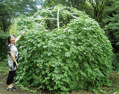 ゴーヤのほかにも主屋の裏手でひっそりとアサガオドームも試作中。こちらはミニサイズだが、開花した可愛らしい姿が早く見たいと待ち遠しそう。