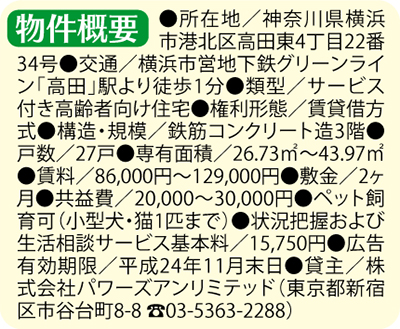 同住宅は、60歳以上の方で要介護1〜要介護5の方でも入居できる。居室は、26・73平方メートル〜43・97平方メートル、ペット飼育もOK。居室には、ナースコールや緊急押しボタンを設置。ヘルパーが常駐し、安否確認や生活相談などのサービスを提供。入居一時金・礼金・更新料すべて不要で月額賃料は、12万1000円〜(管理費・サービス費込み)。その他、食費・水道光熱費は別途必要。