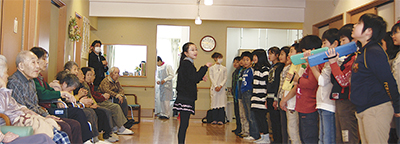 当日は、合唱やピアニカ、リコーダーを用いて「ふるさと」「威風堂々」など数曲を披露。演奏を聴いた利用者の中には、涙を流す姿も。交流の時間も設けられ、座っている利用者のもとへ児童が寄り添い一人ひとりが会話を交わした。