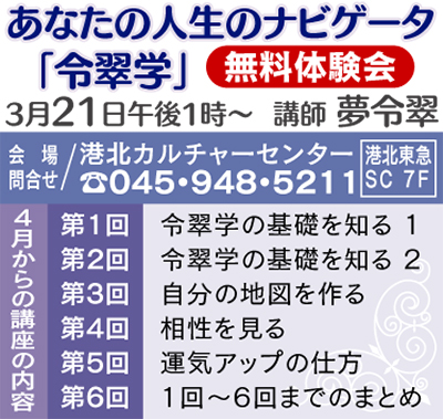 自分を知り、より良い生き方を届けたい―港北カルチャーセンター(港北東急SC7階)で3月21日、令翠学の無料体験会が開かれる。午後1時から。令翠学とは誕生年月日を基に運命を分析、人生を豊かにするヒントを見つける学問とのこと。講師は横浜、川崎を中心に悩みを抱える人や進路に迷った人など数多くの人々を長年に亘り鑑定してきた夢令翠さん。「令翠学は皆さんに希望のある未来を指し示す分析学です。ぜひ、この機会に体験を」と話す。