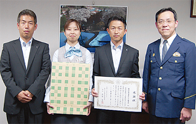 表彰を受けたのは、同支店職員の石川真澄さんと四俣勉さん。4月24日午後3時頃、現金500万円を引き出そうと来店した被害者女性(75歳)に確認したところ、不審な点があったため警察に通報するなどして対応した。女性は、同日午前10時頃、息子を装う人物から「小切手が入った鞄を電車の中に置き忘れた」などと電話を受け、信じてしまったという。