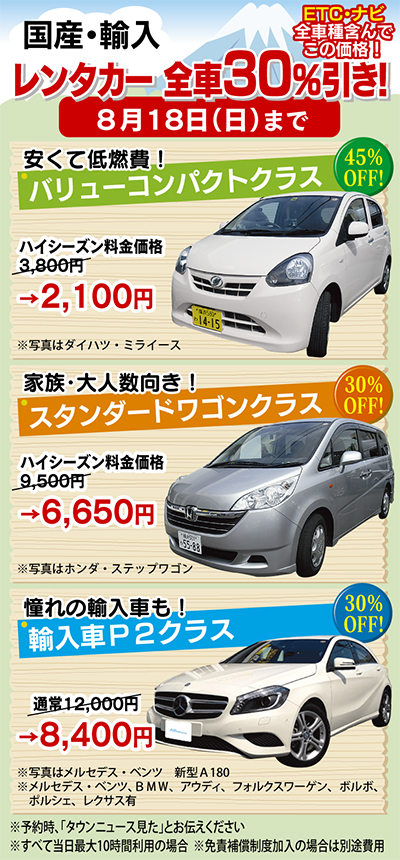 中古車でどこにも負けない最安値販売と高額買取をおこなう『(株)オートスピリット』。同社のレンタカー部門が取り扱う国産・輸入車は総台数200台。「タウンニュース見た」でレンタカーを最大45%引きにする夏休み読者限定特別プランを発表した。