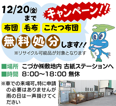 古紙問屋のこづか(株)では、年末限定のキャンペーンとして、12月20日まで【布団・毛布・こたつ布団】の無料処分を行っている。通常、これらの処分費は有料となるため、大変お得!年末の大掃除・収納整理を兼ねてこの機会に利用してみては。