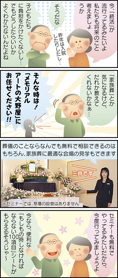 1月は、21日(火)「家族葬セミナー」と27日(月)「エンディングノートの書き方」。10時から12時、同所を会場に行われる。参加無料、予約制。他の日時でも1名様から個別対応しており、希望があれば自宅訪問もしてくれる。