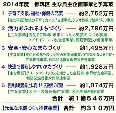 同事業費に充てられるのは1億546万8千円。「子育て」「地域活性」「防災」「快適な暮らし」「区民の満足度向上」の5本柱を軸とする。
