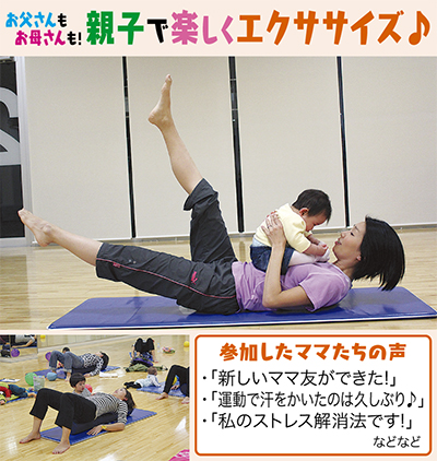 親子ピラティスでは生後1カ月から3歳くらいまでの子どもと一緒に運動が可能。首がすわっていない赤ちゃんでも、お腹に乗せて腹筋運動などで、無理なく運動不足を解消できる。「久しぶりに体を動かせた!」と好評のプログラムだ。