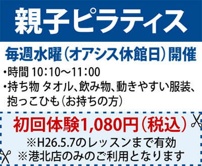 子育て世代が多く住む都筑区で、忙しい日々を過ごしているお父さん、お母さんは多いはず。「子育てに時間をとられて運動不足…」「体を動かしたいけど、子どもを置いて運動なんてできない」という人も多いだろう。港北みなも3階の東急スポーツオアシスでは、そんな人たちへ「0〜3歳の子どもとできる親子ピラティス体験」を行っている。