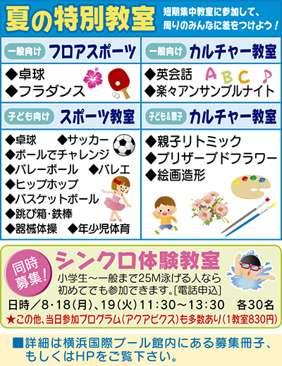 横浜国際プールでは、夏の特別教室の募集を6月2日から開始した。現在、参加者を募集している。