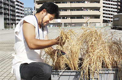 大おにぎり展に関連し、同館屋上で10月17日、今年の5〜6月から職員によって栽培されていた稲の刈り取り作業が行われた。