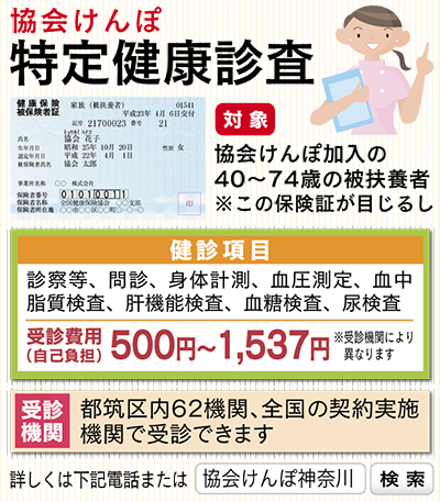 特定健康診査とは、脳卒中などの病気につながる糖尿病など、生活習慣病の原因となるメタボリックシンドロームに着目した健診。健診後は必要に応じて保健師等による保健指導が無料(神奈川県内、他県はHP要確認)で受けられる。対象者は同協会加入の40歳から74歳の被扶養者(家族)。全国で約5万の健診機関で受診でき、費用のうち6520円を協会が補助。県内では500円から1537円(上限)の自己負担で受診できる。対象者には受診券が送付されているが、受診券がない場合は同協会まで連絡を。保険証の保険者名称が「全国健康保険協会」となっていれば受診できる。また健診機関により被保険者と同じ生活習慣病予防健診(特定健診項目以外に胸部胃部レントゲン検査など)も特別価格で受けられるので相談を。※「全国健康保険協会」以外の保険証の人は、各医療保険者へ問い合わせを。