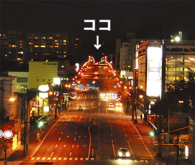 これは同所からセンター北方面を見ると、街灯が「トトロ」のシルエットに見えるといわれる都筑の隠れた夜景スポット。一年を通して見ることができるが、冬ははっきりとその姿を確認できる=写真。デートや家族で出かけた時に眺めてみては。