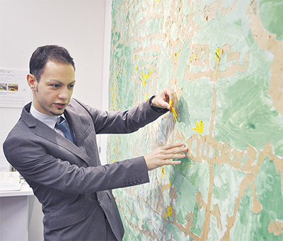 これは同ハウスの自主事業で、毎週土曜日に子どもたちの集いの場となる「土曜クラブ」のアートクラスが手がけたもの。都筑区にも事業所を構え、以前から交流があったテュフの協力のもとで実現した。展示されているのは、つなぎ合わせた模造紙にクラフトテープを貼った大型作品。街にはマンションや民家、ショッピングビル、飛行機など子どもたち独自のアイデアが満載で、最大幅7mほどの作品4枚が並ぶ。来場者は人型のシールをその作品に貼り、街に人をあふれさせる参加型のワークショップだ。子どもたちのほか、テュフのスタッフも参加し、街にはすでに100枚以上のシールが貼られている。テュフラインランドジャパン(株)マーケティング部広報課の井田美穂さんは「子どもたちの作品は社内を華やかに飾ってくれています。気軽にシールを貼りに来てください」と話している。