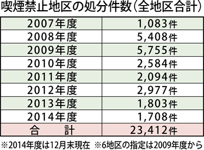 横浜市が喫煙禁止地区に指定している6地区で、指定が始まった2007年度から昨年末までの違反者に対する過料処分件数が約2万3千件に上ることが分かった。年5千件を超えていた件数は減少傾向にあるものの、依然、ゼロには近づかない状況。危機感を募らせる市では、周知の強化に乗り出している。