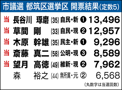今選挙から定数1増の5議席を6人で争う形となった都筑区の市議選。現職は自民の草間剛氏、公明の斎藤真二氏、維新の望月高徳氏がそれぞれ議席を守った。新人は、嶋村勝夫氏の後継として立った長谷川氏が1万3496票を獲得してトップ当選、さらに民主の木原幹雄氏が初当選した。民主として市議2期を務めた森裕之氏は今回無所属として臨んだが、返り咲きを果たせず涙をのんだ。