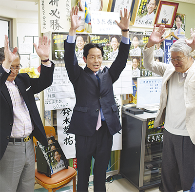 午後11時15分過ぎ、開票速報を待つ敷田氏の事務所に当確の一報が入ると支援者から大きな拍手に包まれた。敷田氏は「(選挙は)何度やっても厳しい戦い。常に支えていただき、力強いご支援を受けた結果です」とあいさつし、「初心に立ち返り、謙虚さを失わないよう心がけ、引き続き治安や災害対策、医療福祉問題など本来の役割、使命を担い努力していきたい」と思いを新たにした。