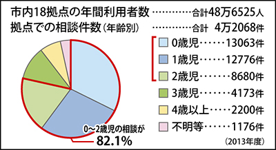 全市的な事業開始に先駆け、すでに神奈川区の地域子育て支援拠点「かなーちえ」では今年2月からモデル事業を実施。横浜市内18区にある拠点の年間利用者数は約49万人(13年度)。拠点での相談件数は4万件を超え、そのうち82・1%が0〜2歳児の保護者だ。