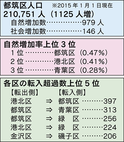 1年間の人口の増減、転入者や転出者数などの推移を示す横浜市人口動態。2015年1月1日現在の都筑区人口は21万751人で、昨年度に比べ1125人の増加。港北区(2764人)、磯子区(1893人)、鶴見区(1850人)神奈川区(1405人)に次いで5番目に多かった。