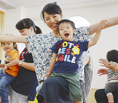 当日は子どもが親の背中を押すストレッチや、抱っこしながら片足立ちなど、子育てしながらでもできる体操が紹介された。また歌に合わせて簡単なダンスなどもあり、子どもたちの笑顔が絶えない教室になった。