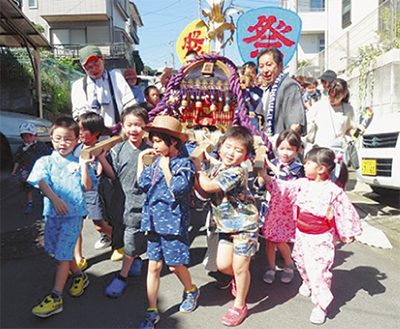 都筑ヶ丘幼稚園(川和町)で7月21日、夕涼み会が行われた。当日は川和上サ囃子連とともに子どもたちが神輿を担いで町内を練り歩いた=写真=ほか、園庭では模擬店が並び、色鮮やかな浴衣を着た人たちが多く見られた。