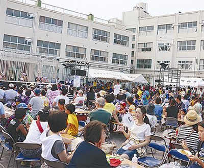すみれが丘小学校で第6回すみれ夏祭りが8月1日に行われ、約5500人が訪れた=写真。当日は同校のゆるキャラ「ビオラ」との記念撮影コーナー、参加者で巨大壁画を作るモザイクアートなどの企画が並んだ。また夜の特設ステージではジャズタイムなどもあり、会場の雰囲気が一変。フィナーレには打ち上げ花火も上がり、大人も子どもも楽しむ姿が見られた。