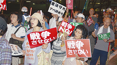 当日は都筑区役所前に参加者が集合。それぞれが廃案のメッセージを込めたプラカードやのぼりを掲げ「戦争法案絶対反対」「今すぐ廃案」などと訴え、センター南駅周辺を約1時間練り歩いた。