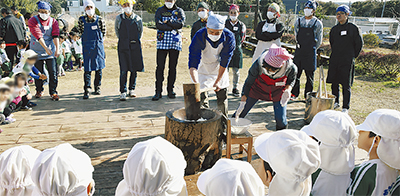 同園は食育も兼ね、新年の行事を体験するために毎年餅つきを実施している。園内に設置したかまどでもち米を炊くところから、できあがる過程を観察しながら餅つきを行った=写真。「だんだんお餅になってきた」と楽しそうに話す園児の姿が見られた。