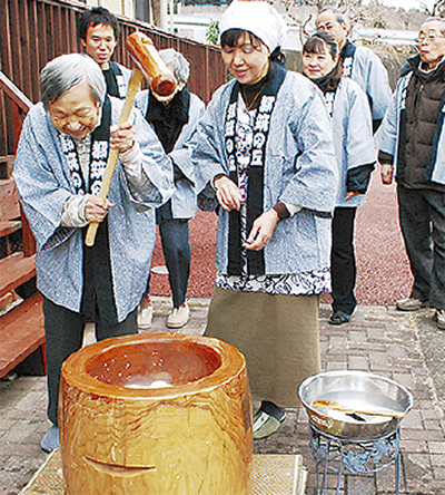 川和町の介護福祉施設、グループホーム都筑の丘(村田博幸理事長)で11日、毎年恒例の新年餅つき大会が開催され、利用者やその家族、地域ボランティアら約100人が参加した。